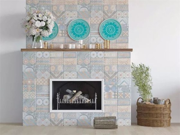 与花砖壁炉、厨房背墙和磁砖地面塑造优雅轻盈印象,加上由浅木色、粉末蓝勾勒出区域,统一调性又保留跳色活力