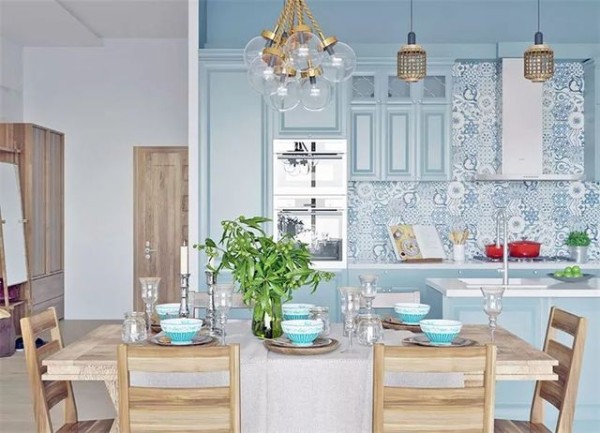 与花砖壁炉、厨房背墙和磁砖地面塑造优雅轻盈印象,加上由浅木色、粉末蓝勾勒出区域,统一调性又保留跳色活力。