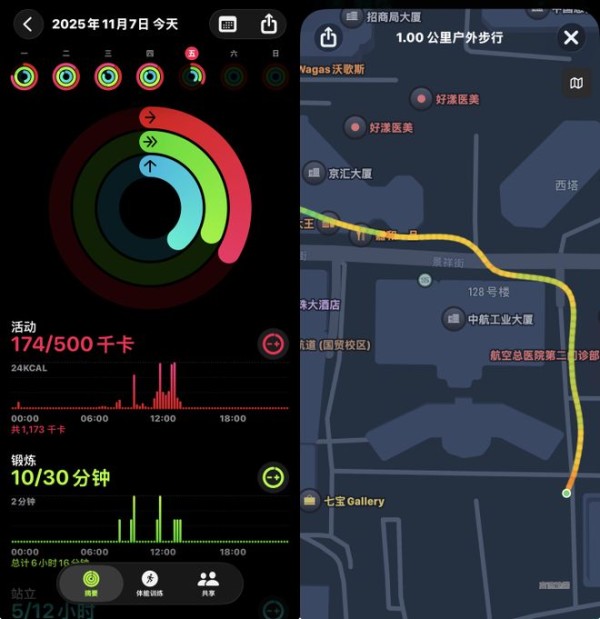 得益于双频GPS技术,Apple Watch Ultra 3在户外运动时的轨迹记录极为精准。实测在北京狭窄道路环境中步行,这款手表记录的运动路线几乎可以做到一比一还原,甚至还能显示建筑物中穿行的路径。