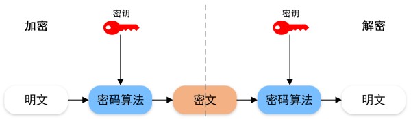 密码通常分为加密和解密,即明文和密文的转换过程。加密,就是通过一系列方法或规则,使用密钥将明文隐藏起来变成密文的过程。解密,就是通过一系列方法或规则,使用密钥将密文恢复成明文的过程。其中提到的一系列方法或规则,我们称之为密码算法。一个典型的加解密流程如下图所示。