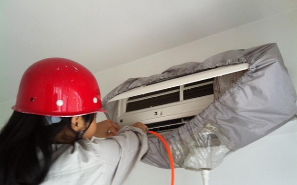 2、套上空调防水罩,喷洒空调清洗剂清洗铝翅片。