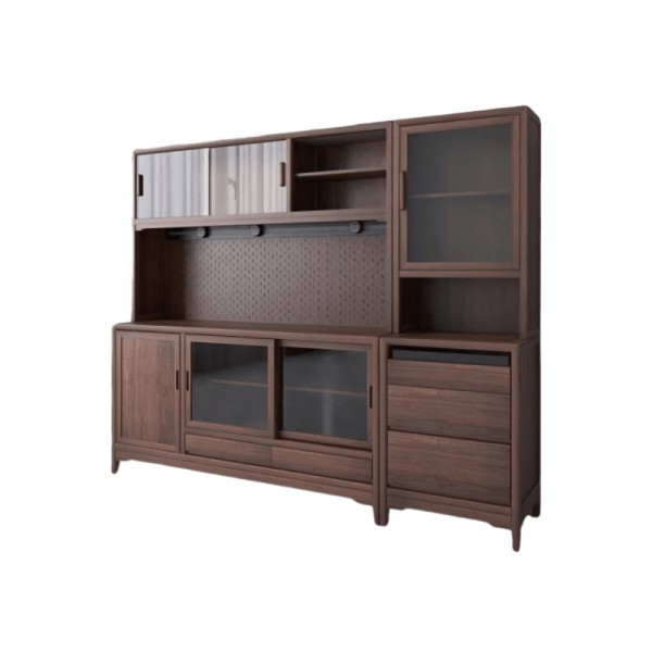 最后,我们来看杞枝实木餐边柜。这款高柜以北美黑胡桃木为主要材质,展现出新中式的优雅设计。它不仅仅是一款储物柜,更是一件可以提升家居格调的艺术品。