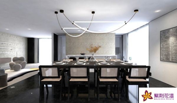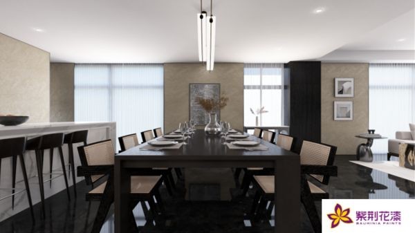 餐厅的布局是整体家装中最容易被忽视的部分,大部分餐厅空间与客厅在布局上有承接,因此在色调大方向上的统一,可以加强视觉的统一性和适应度。紫荆花艺术涂料1982产品系列-Hine御鹿绒_LAFH-36_灰白,与客厅蚕丝灰格调一致却略有不同,既能体现整体的设计性又能突出餐厅的小心思。吃饭也需要一种仪式感!
