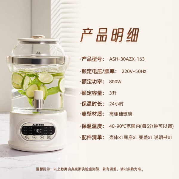 这款奥克斯养生壶采用800W大功率加热,快速满足饮茶需求,3升大容量满足小家庭或朋友聚会的饮品需求。高硼硅玻璃与316不锈钢的完美结合,美观且安全,让你在享受健康饮品的同时,亦不失生活的美感。