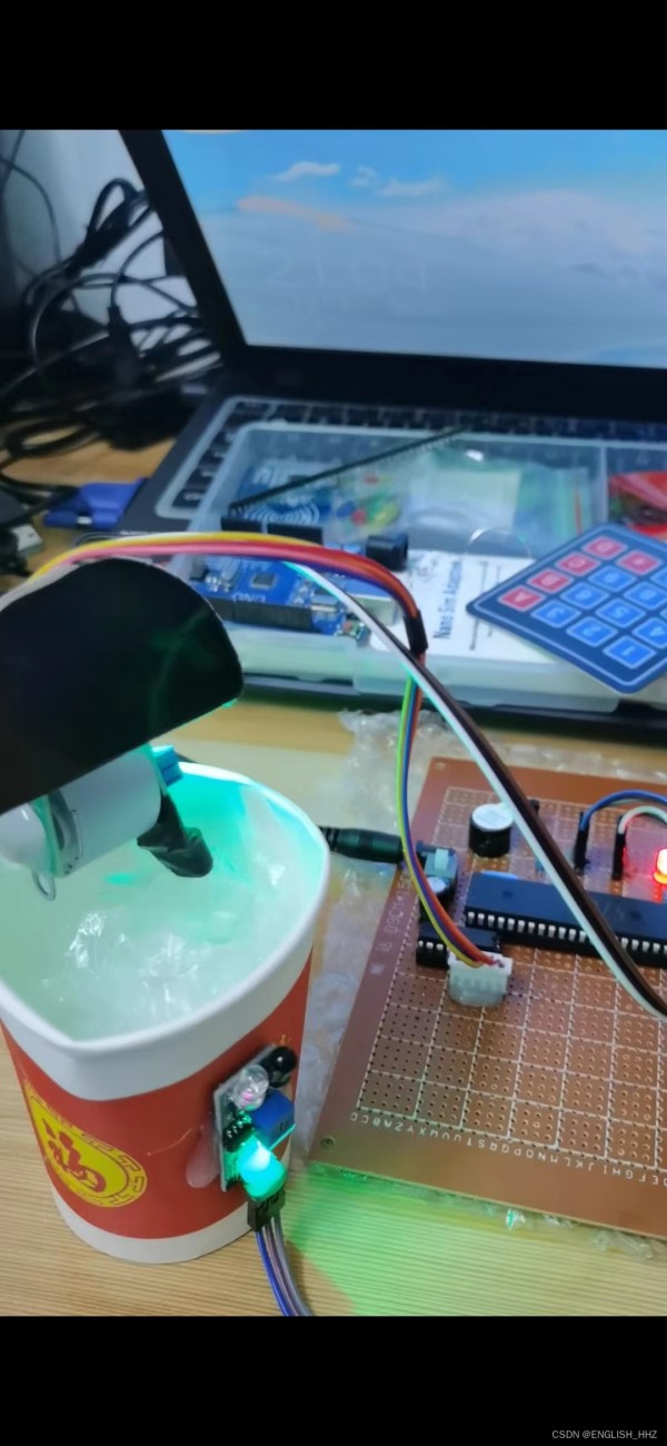 3、红外2(放内部)检测是否装满(模拟安装在顶部,如果持续时间4s都检测到有东西,那么就led 蜂鸣器 报警提示)