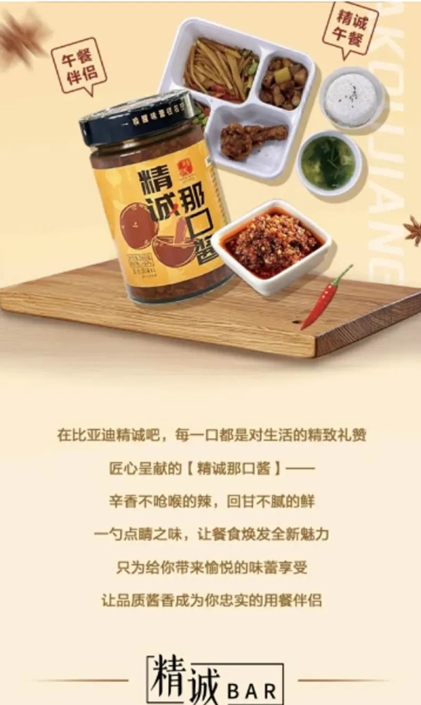 在比亚迪的售后服务体验中,有一个细节正悄然温暖着众多车主的心,那就是售后午餐中的 “精诚辣酱”。它不仅为车主们带来了舌尖上的享受,更成为了比亚迪精诚服务理念的独特注脚,让每一位车主的用车生活都能 “餐餐倍儿香”。