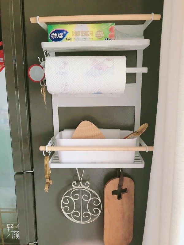 小钩安置刨子、剪刀等小物件,悬挂晾干很方便。上层放置保鲜袋、保鲜膜。中层收纳厨房纸。下层安置小碟子、清洁海绵等物品。有的款式是小钩安置在下侧,我这个是侧边的,所以下面我放的隔热铁架和实木砧板是用的自购的磁吸式挂钩。