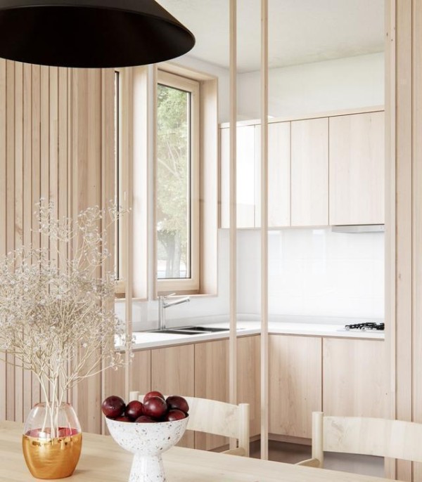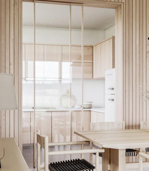 U型厨房设计,最大程度地提高收纳和改善空间利用率,良好的采光让厨房更通透敞亮。木色与白色结合,干净而清爽。厨房玻璃门选择了浅色调的门框,与周围形成高度统一,弱化视觉感受,整体统一。