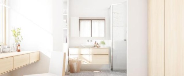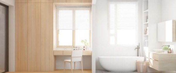 衣帽间和卫生间采用开放式布局,空间更加通透敞亮。梳妆台与浴缸利用承重墙完美分隔,一边原木一边纯白,自然又干净。卫生间采用浴缸和淋浴结合设计,满足了各种需求。浴缸区设计壁龛,提高收纳整体又美观。