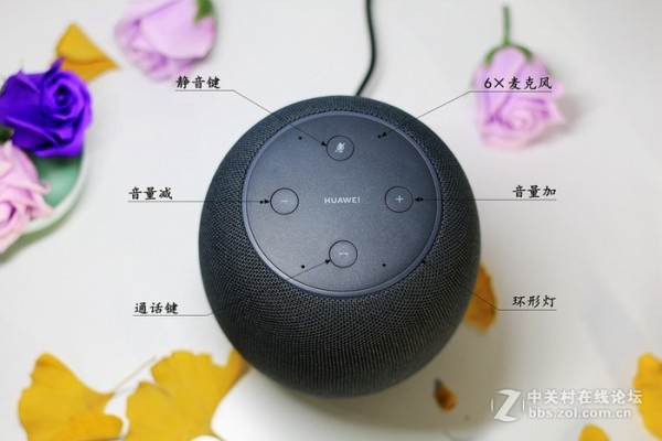 在按键方面,华为AI音箱在顶部面板采用了4个实体按键。在微微凸起的圆形按键表面印制了功能标识,分别是静音键、音量加、减和通话键。在实际使用过程中手感还是非常不错的。