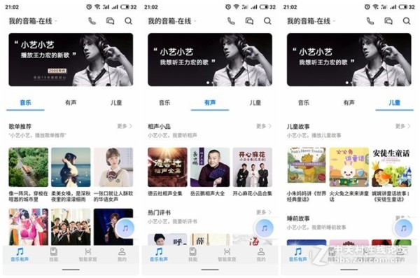华为AI音箱APP的主页面由音乐有声、技能、智能家居和我的组成。在音乐有声的界面又分成了音乐、有声和儿童三个类型。华为AI音箱内置了华为音乐、蜻蜓FM、口袋故事、贝瓦儿歌、互动百科等多家精彩内容。对于资源方面华为AI音箱还是非常丰富的。不过在一些音乐方面的资源,仅有翻唱的歌曲,如刘珂矣的《半壶纱》。