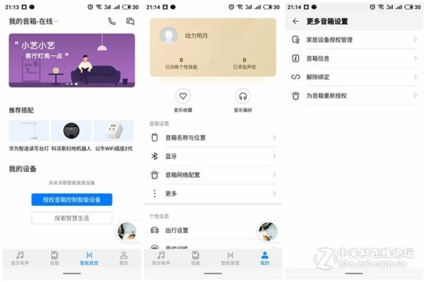 在智能家居界面,可以设定相关的智能设备通过音箱语音进行控制。因手头没有可支持的设备无法体验,这里就不作评述了。在最后的我的界面里,可以设置音箱;查看个性信息及升级更新等操作。