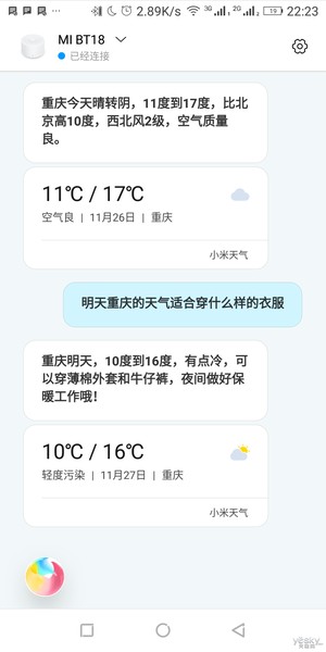 整个连接过程非常方便,无论是非小米安卓手机还是小米安卓手机都可以快捷的连接。添加设备成功后,长按话筒键,听到“叮”的提示音激活语音助手后,即可实现语音查询天气,询问时间,听音乐,定闹钟等功能。
