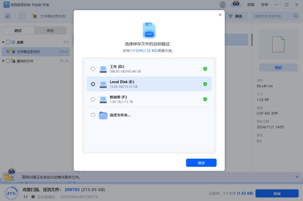 步骤五:勾选需要恢复的桌面文件,点击软件右下角的“恢复”按钮,在弹出的窗口中选择文件的保存位置。注意。保存位置不能选择原桌面文件所在的分区(C盘),建议选择其他分区(如D盘、E盘)或外接存储设备,避免恢复的文件覆盖原丢失文件的残留数据,导致恢复失败。选择完成后,点击“确定”,软件开始恢复文件,等待恢复完成即可。