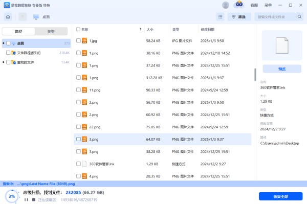 步骤三:在扫描过程中,可随时暂停或停止扫描,若已找到目标文件,无需等待扫描全部完成即可进行恢复。
