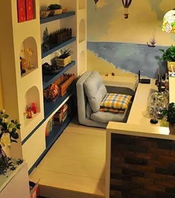 为了减少对客厅有限空间占用,将房子墙体打薄,依墙体打造了书柜,拱形的顶部设计、蓝色的隔板很符合地中海的风格。这样本来客厅一侧的一面白墙,被扩充成了一个迷你的榻榻米工作区。