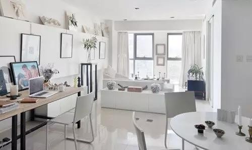 这个客厅空间利用极为充分,但并不拥挤。不仅用矮柜区分了客厅和餐厅,餐桌相对的墙面也不放过,摆放长条形书桌,在小空间里打造了宽裕的工作区,白色和原木色搭配,颜色一致,显得干净有序。
