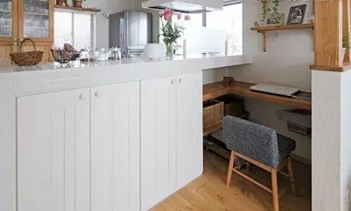 厨房和就餐区中间的空余出一个小小的空间,一般人家都做留白处理。但其实将其布置为工作区是不错的,将原本尴尬的空间升级为实用的空间,提升空间利用率,颇具参考价值。