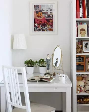 客厅一角,在书架和墙壁中间挤出了一块小小的读书区域,两盆新鲜绿植、一个手作人偶和复古圆镜,在这样简单清澈的环境中看看书,简单满足。