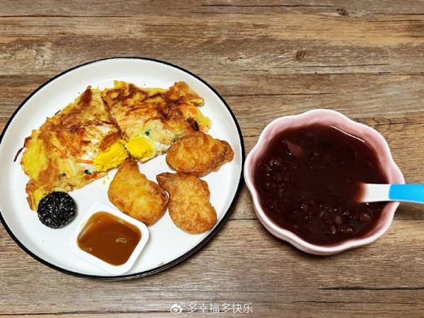 早餐一:红枣紫米粥、土豆鸡蛋饼、炸鸡块、黑芝麻丸。