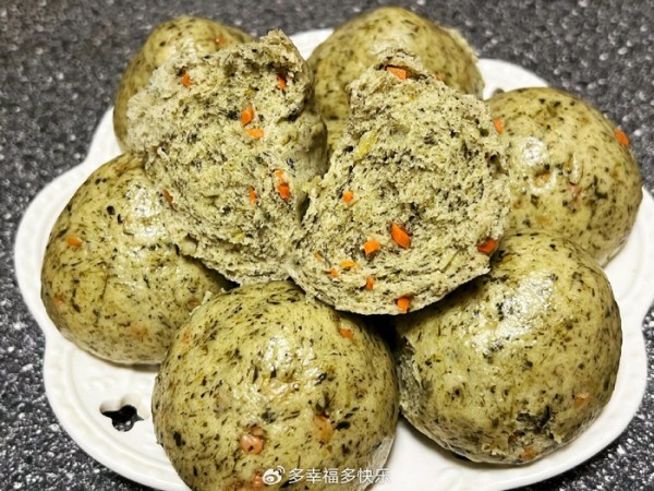 因为加了菠菜,颜色有些发绿,吃起来有菠菜的香甜,胡萝卜建议切得再碎一点,用开水焯一下或炒一炒,变软后再用来揉面,应该会更好,下次我再改进一下。
