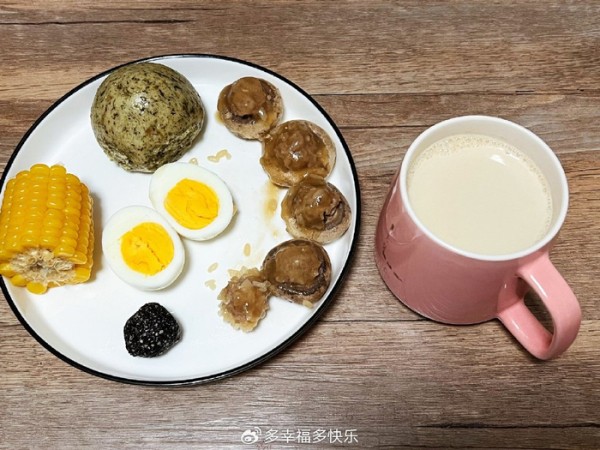 早餐二:自制奶茶、煮鸡蛋、菠菜胡萝卜馒头、玉米、口蘑酿肉、黑芝麻丸。