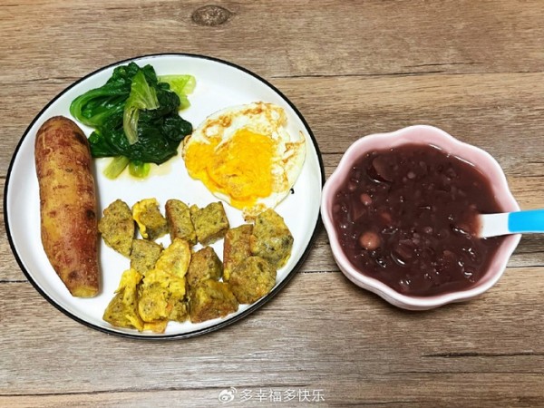 早餐三:红枣银耳紫米粥、蛋煎馒头丁、蒸红薯、煎鸡蛋、蚝油生菜。