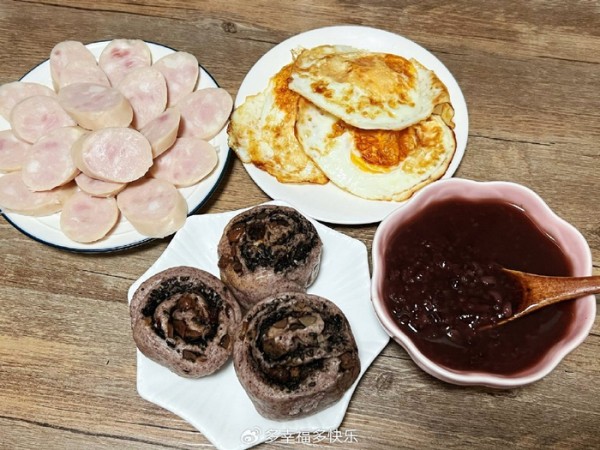 早餐六:紫米粥、红枣葡萄干馒头卷、老北京蒜肠、煎鸡蛋。