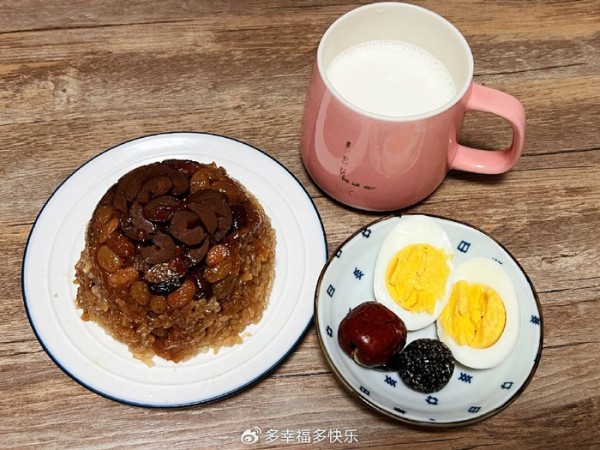 早餐五:牛奶、红糖糯米饭、煮鸡蛋、黑芝麻丸。