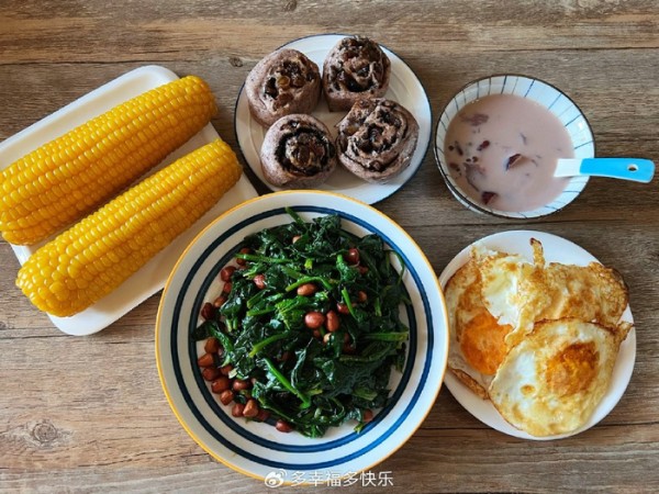 早餐七:牛乳双红西米露、玉米、菠菜拌花生米、红枣葡萄干馒头卷、煎鸡蛋。