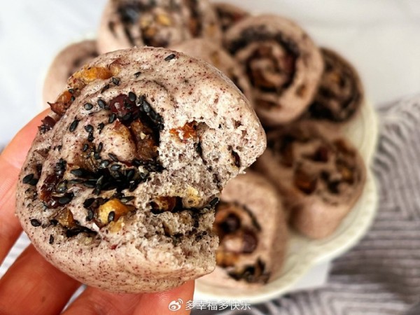 馒头卷的口感很好,小麦面粉里混合了黑米粉,加入清水和酵母粉,混合成柔软光滑的面团,发酵至两倍大,排气揉均匀,擀成长方形的面饼,铺上红枣碎、葡萄干、熟黑芝麻,从一侧卷起,收口压在底部,切成小段,切面朝上,醒发15分钟左右,开水上锅蒸熟即可。
