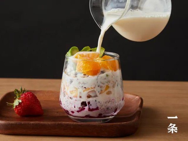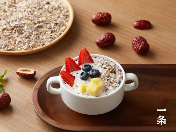 工作或闲暇时刻,使用谷物麦片搭配酸奶、水果,做出一份美味的麦片水果捞,以营养美味补充能量。