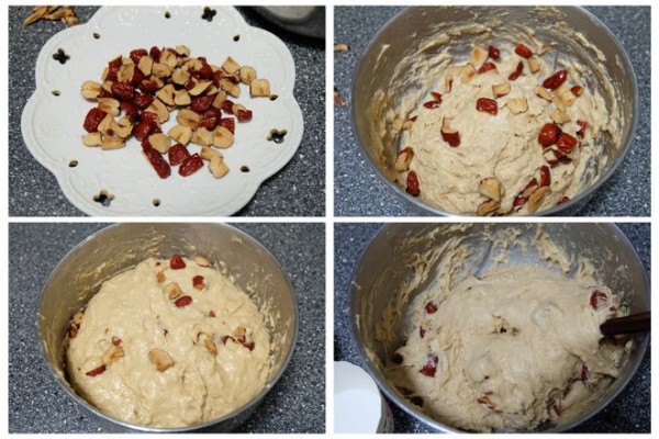 3、部分红枣去核切碎,也放到小盆里,用筷子搅拌均匀至无干粉、浓稠的面糊状态,盖上盖子,发酵30-40分钟左右。现在是八月份,室温较高,发酵时间也会短一些。