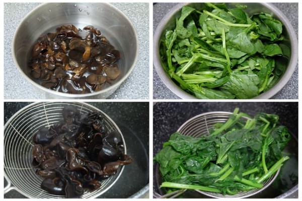 1、黑木耳是干的,需要放在温水里泡发后清洗干净,菠菜去根洗净,沥水备用;