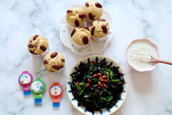 主食是红糖红枣发糕,我用耐高温纸杯蒸出来的红糖发糕像小蛋糕一样,好看的纸杯装着松软美味的发糕,香甜可口,表面微裂,每次蒸它都特别受孩子们的喜欢。没有纸杯也可以用家里的小碗蒸,也很方便。