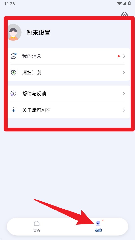 3、在底部点击“我的”进入个人中心,可查看消息、清扫计划、帮助与反馈以及关于APP等功能模块。