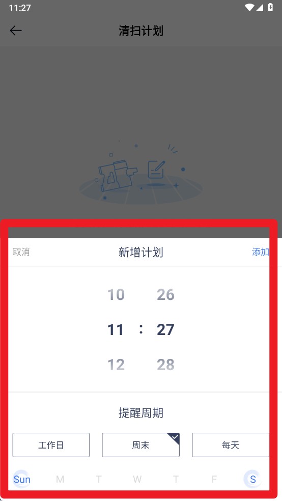 5、在“清扫计划”中可设置设备的自动清扫时间与周期,支持选择工作日、周末或每天,让清洁更智能化。