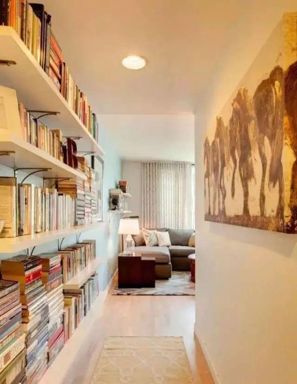 如果你家也有走廊,可千万别空着了,因为走廊也是家中藏书的好地儿。只需几排木架,即可为您组装成实用与颜值并存的书架,学会了吗?