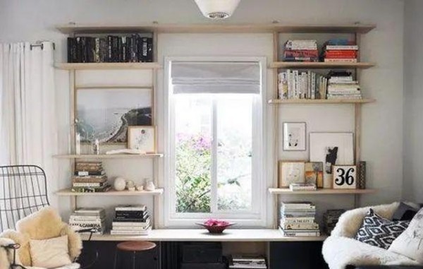 窗边常被遗忘,因为窗边自身条件极好——采光,超级适合做成书架。你可以选择从上至下的书架设计,这样的操作简单省钱。如果你想同时拥有书架+书房,窗台边可做成宽面,这样就可以做到藏书看书两不误啦!