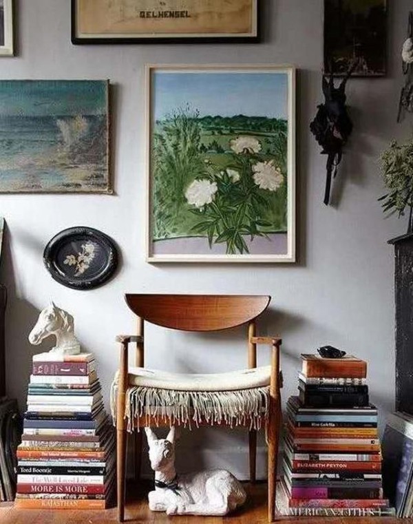 对于喜欢折腾的你,可以尝试把书籍摆放成金字塔样式,放置于椅子旁搭配一些石膏像,艺术区就这样完美呈现在自己的视线中。