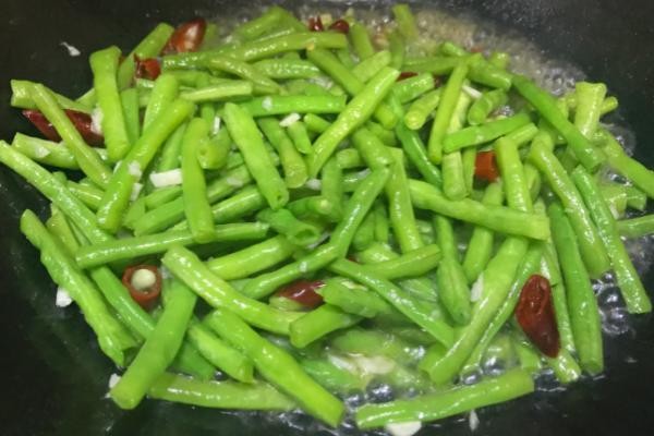 待蒜末和干辣椒的香气四溢时,将切好的长豆角段倒入锅中,转大火快速翻炒。由于长豆角本身不易熟,这一步需要保持锅内温度较高,通过快速翻炒使豆角受热均匀,同时避免炒焦。