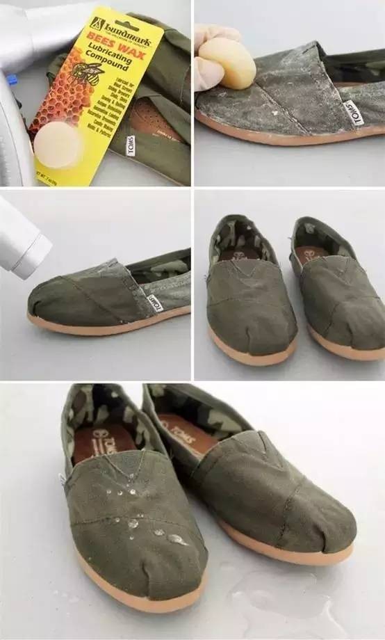 准备一块透明的蜂蜡或家用蜡烛,用吹风机将蜡稍微融化后往布鞋表面涂抹。然后再用吹风机将蜡熔化在鞋面上,渗进去后就难以看到蜡的痕迹。
