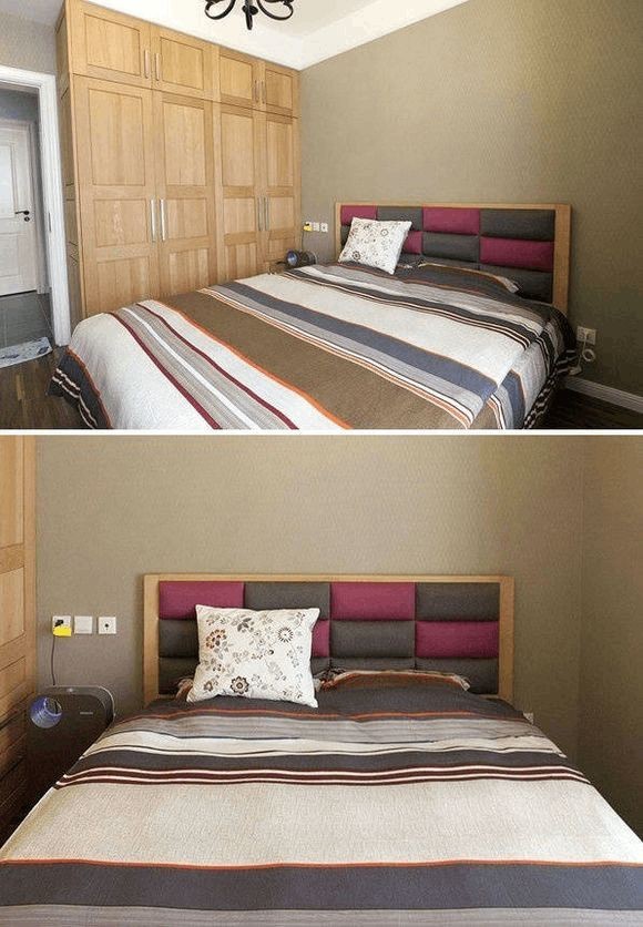 卧室效果,这个媳妇还是比较满意的。床头和床体的颜色以及衣柜墙壁的颜色搭配都是比较和谐的,一点也不会显得突兀