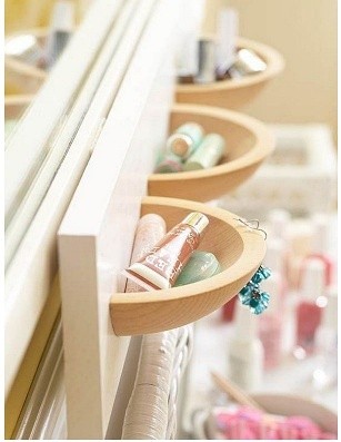 在墙上钉上木质半碗形状的收纳盒,分门别类的放进去日常浴室用品,整洁又美观!