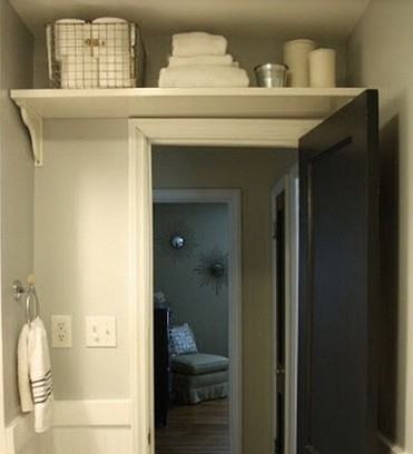 无处不在的收纳心机,如果浴室空间真是有限,也只能出此下策了,在门框上方开发一处收藏空间,那些毛巾、卷纸类就收在那里!但取出时一定要注意安全哦!