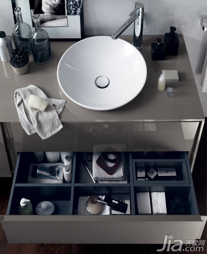 收纳亮点:带有隔断划分的抽屉细分零碎物品 带有多层抽屉的洗手池绝对是小浴室的必备法宝,合理地利用起洗手池下面的空间才是真正的收纳赢家。如果抽屉里面还能分出功能隔断来那便是最方便的。