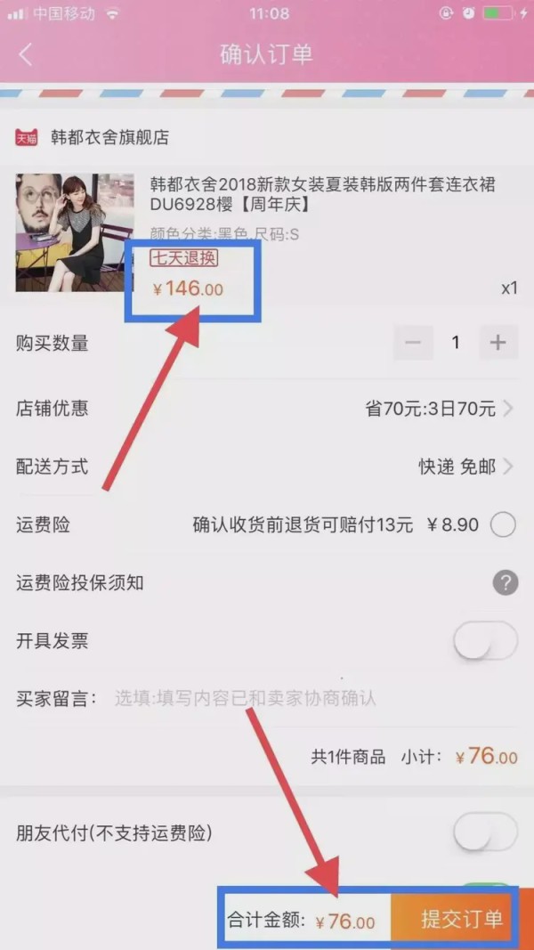 点击【提交订单】立即省下70元