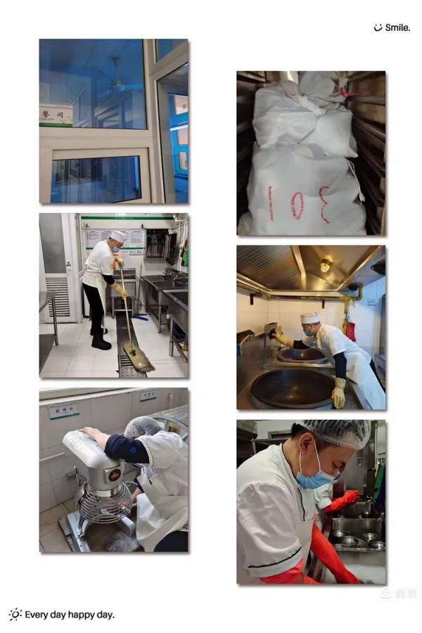 食堂师傅对餐具、灶台、地面、和面机等进行消毒,并对分餐间进行紫外线消毒