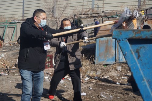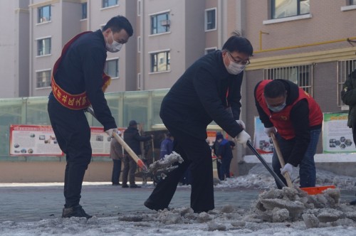 在整治行动中队员们集中清理广场上的积雪垃圾,楼前房后堆积杂物、陈旧垃圾,消除卫生死角,做到环境干净整洁。