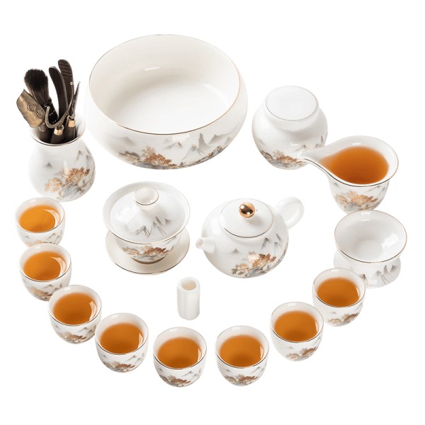 金镶玉功夫茶具则是一款高档的陶瓷茶具,适合送人或家庭使用。其精美的手绘图案和传统工艺使得每一套茶具都独一无二,能够提升饮茶的仪式感。对于喜欢品茶的人来说,这套茶具不仅实用,更是一种生活品味的体现。